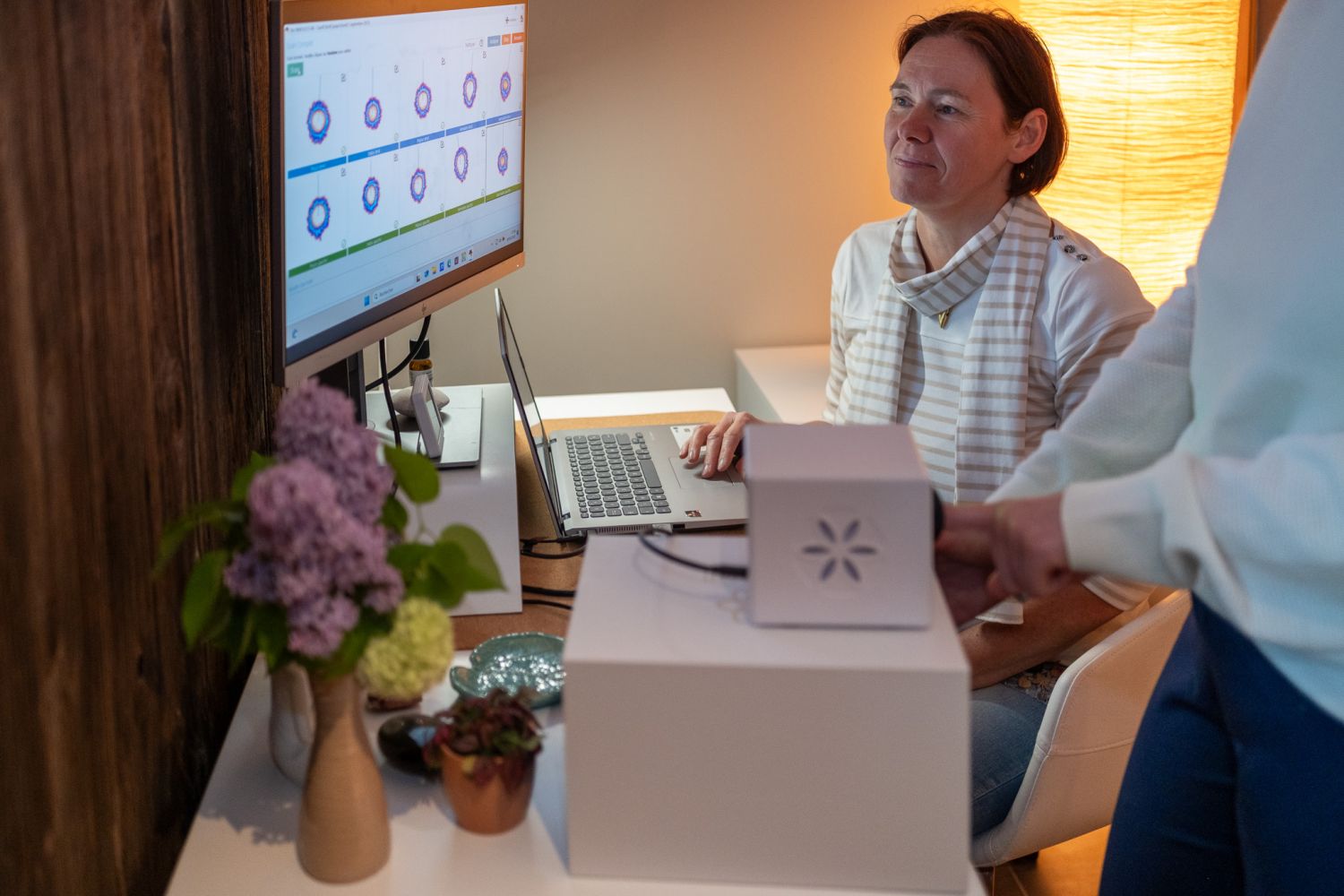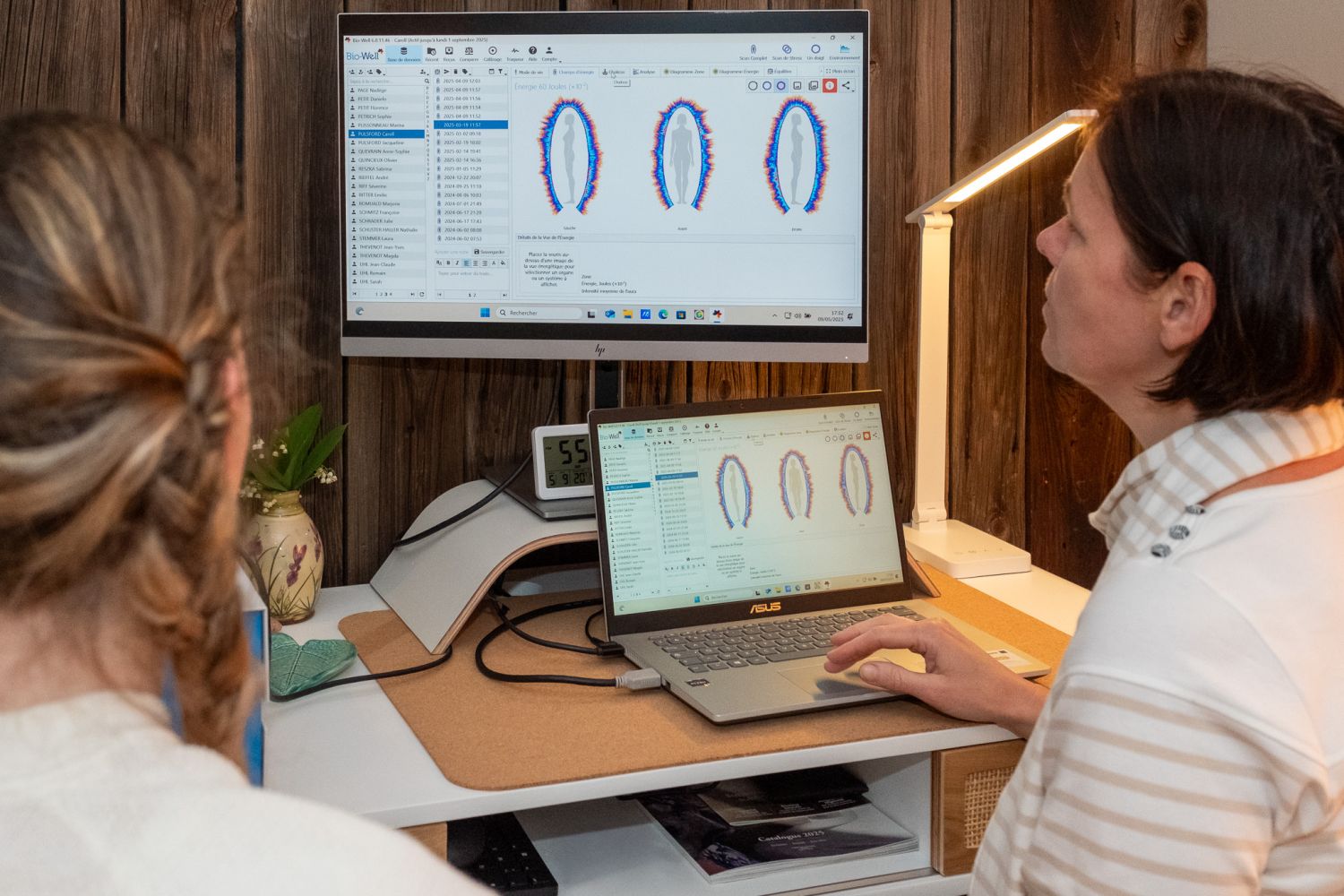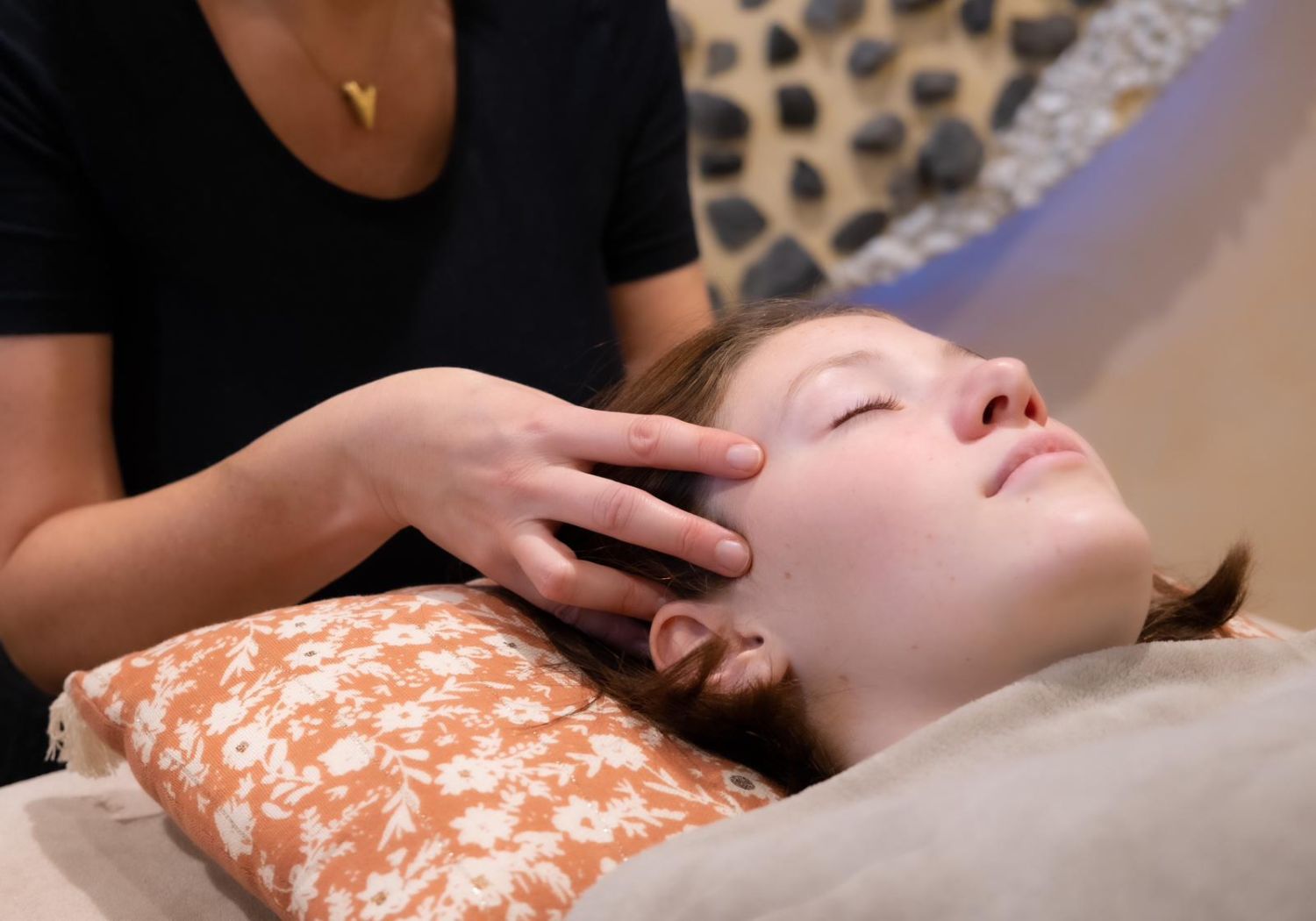 La séance débute toujours par un échange afin d’évoquer la raison de la prise de rendez-vous. En position allongée et habillée sur une table de massage couvert par un plaid bien au chaud.