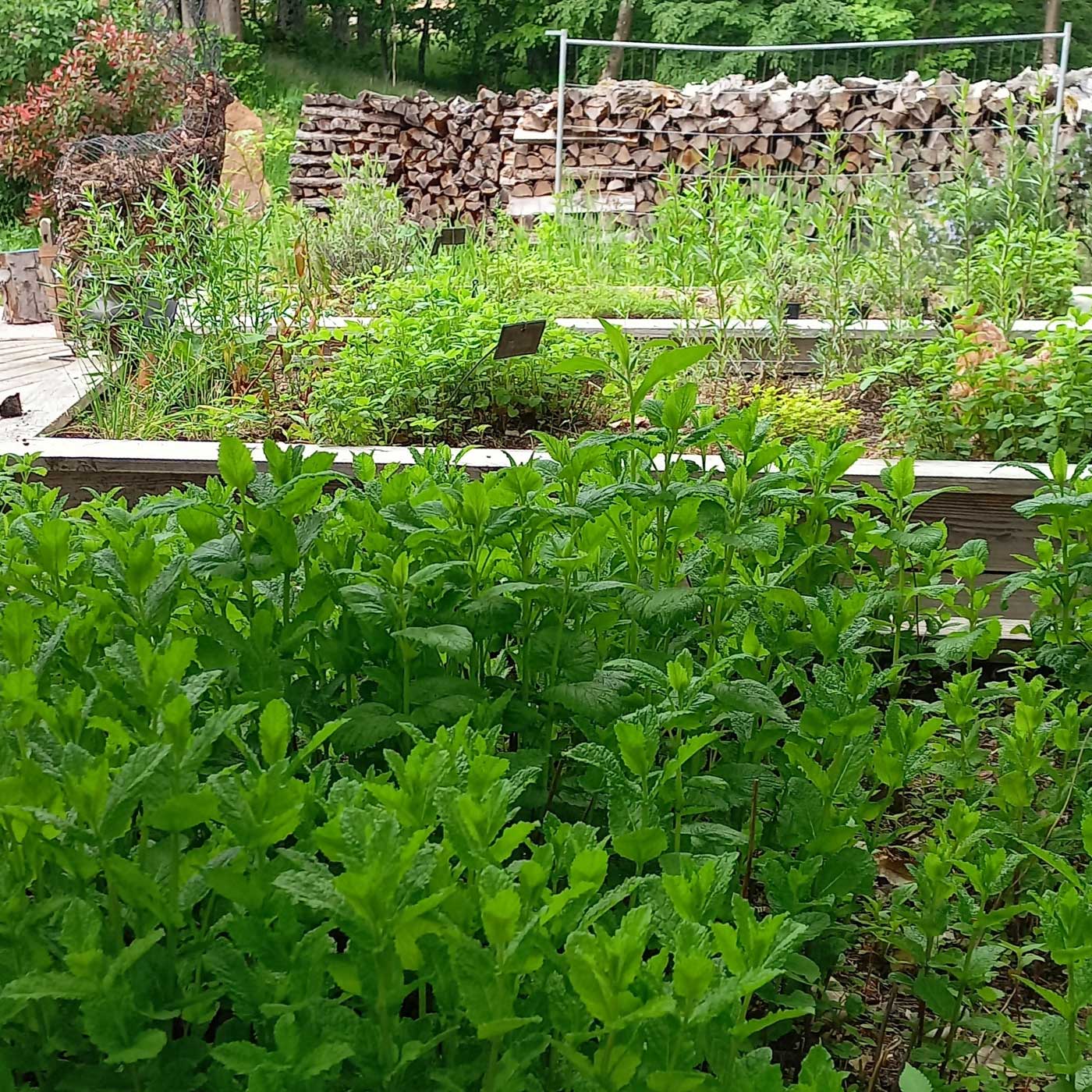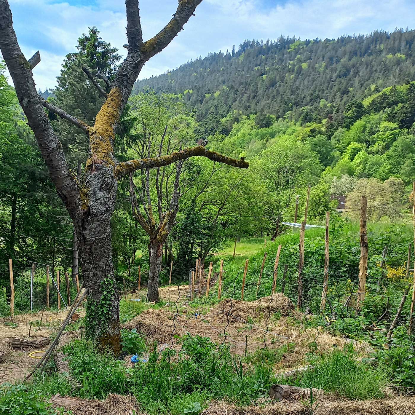 En face de la maison familiale est entretenu un potager en permaculture dans lequel poussent fruits et légumes de saison.